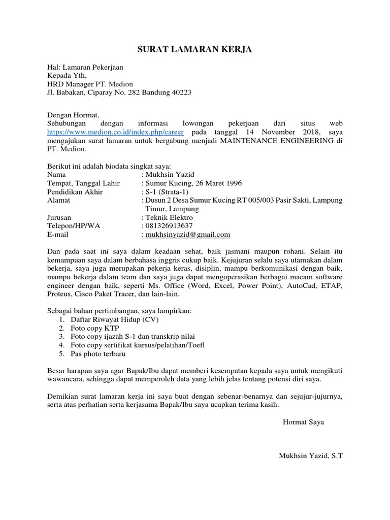 Anda tentunya harus mencari perusahaan yang mau menerima calon karyawan yang belum memiliki pengalaman. Surat lamaran kerja ini merupakan hal yang paling penting saat ingin melamar pekerjaan. Surat lamaran kerja adalah surat yang berisi penawaran keahlian, kemampuan atau jasa terhadap suatu perusahaan atau instansi tertentu. Surat lamaran merupakan surat permohonan yang dibuat oleh para pelamar pekerjaan atau pencari kerja, kemudian dikirimkan terhadap suatu badan usaha maupun instansi untuk mendapat pekerjaan maupun jabatan berdasarkan lowongan pekerjaan ditawarkan. Surat lamaran kerja adalah surat yang digunakan untuk melakukan permohonan mendapatkan pekerjaan sesuai pengalaman pada perusahaan tertentu. Gunakan desain layout yang menarik & profesional. Baca disini ⏩ style indonesia, style luar negeri, tips kirim email. Apakah anda ingin lamaran kerja yang anda ajukan langsung diterima? Sebagai tambahan anda dapat menyertakan berkas lainnya yang dapat menunjang karir anda, agar peluang. Membuat surat lamaran kerja format doc ataupun microsoft word yang baik dan benar memang menjadi suatu keharusan jika ingin lamaran yang anda kirimkan mendapat perhatian dari pihak hrd. Contoh surat lamaran pekerjaan untuk beberapa sumber informasi lowongan, diambil dari sumber di internet dan dilakukan modifikasi, semoga bermanfaatdeskripsi lengkap. Ada banyak faktor yang harus kita perhatikan. Berfungsi sebagai langkah pembuka bagi seseorang untuk bekerja di suatu tempat.