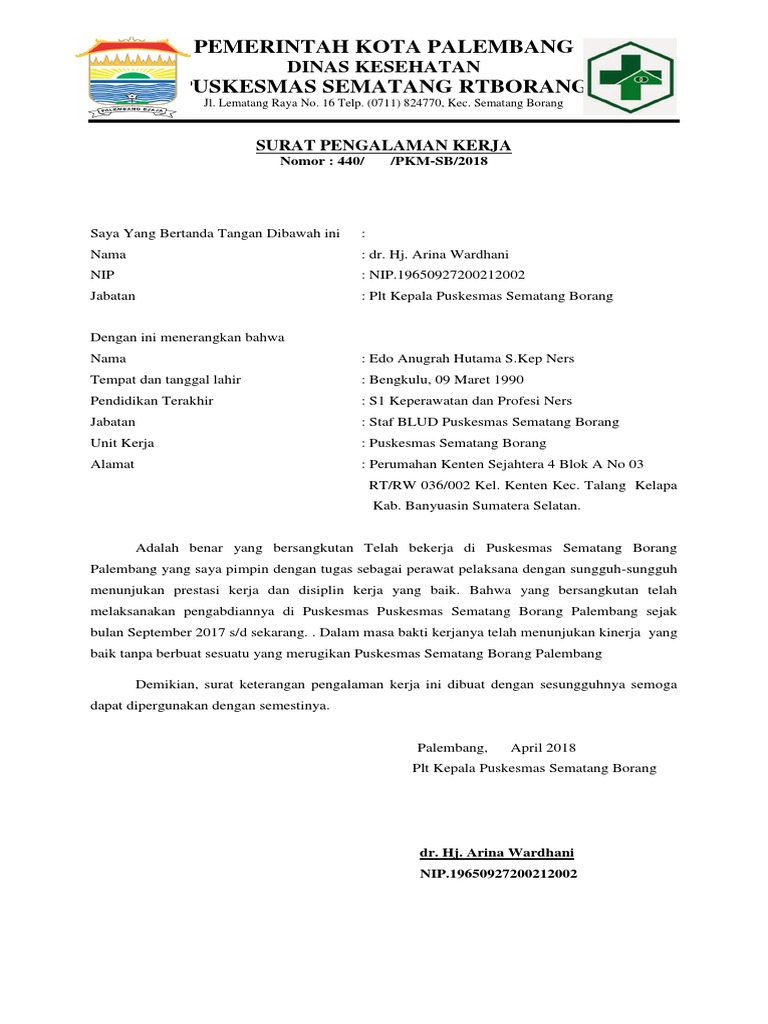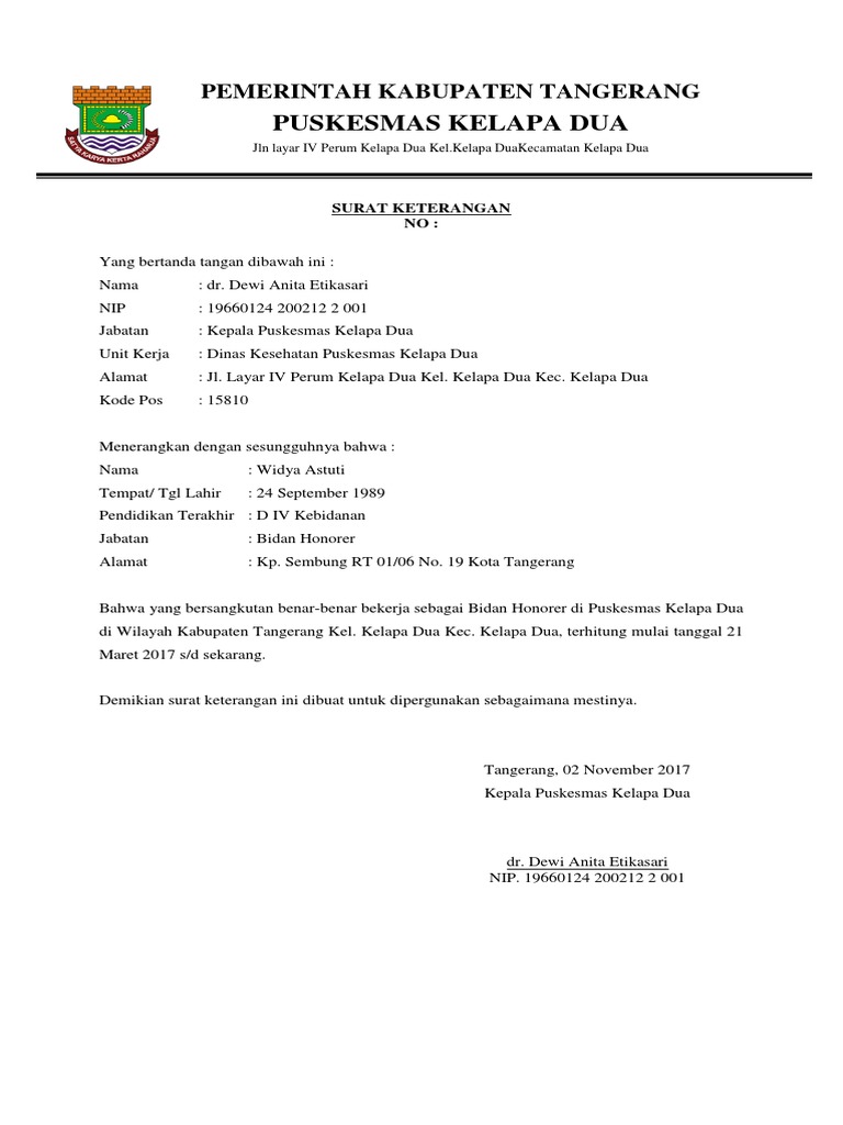 Contoh surat pengalaman kerja adalah surat yang dibuat atau dikeluarkan oleh suatu instansi atau perusahaan daftar isi. Puskesmas harus sesuai ktp puskesmas di harapan indah bekasi puskesmas di jakarta selatan puskesmas di jakarta timur puskesmas di jogja. Savesave contoh surat keterangan bekerja for later. Contoh surat lamaran kerja bidan di puskesmas. 37 contoh surat lamaran pekerjaan via email. Dilengkapi contoh kerja sebagai guru, sopir, pegawai puskesmas, pt, dll. Noor athiyah text of contoh surat keterangan bekerja. Surat ini biasanya digunakan untuk berkorespondensi dengan pihak asing, baik lembaga pemerintahan. Saya juga melampirkan surat keterangan dari bidan mengenai perihal yang tersebut di atas. Contoh surat keterangan kerja untuk npwp. Mengenai pekerjaan yang saya tinggalkan selama saya meminta izin, akan saya kerjakan setelah saya mulai masuk bekerja kembali. Isi dari surat keterangan kerja juga menerangkan perilaku dan profesional kita pada saat bekerja di suatu perusahaan. Dan jangan lupa untuk menyertakan sejumlah berkas seperti contoh diatas.