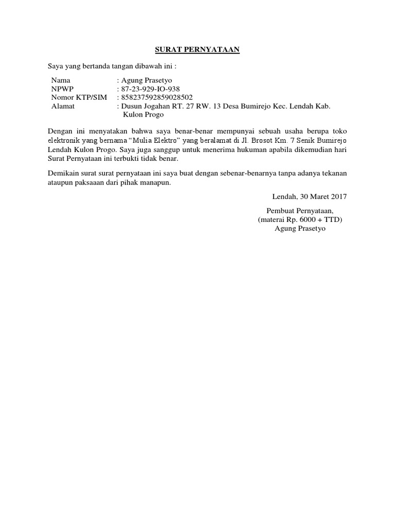 Dalam hal ini ketika seorang mengalami gagal bayar, maka pihak pemberi pinjaman dapat menuntut. Namun ada kalanya pernyataan yang akan diberikan harus dengan menggunakan surat, baik itu menyatakan diri sendiri ataupun menyatakan tentang orang lain. 3) asli surat keterangan tidak buta warna dari dokter pemerintah; Surat pernyataan bermaterai 6000 tidak berkedudukan sebagai pns 9. Desa katialada kecamatan kwandang kabupaten gorontalo utara nama sekolah. Membuat surat gugatan yang akan ditujukan ke tergugat secara resmi bermaterai. Pernyaataan keaslian biasanya diletakkan di belakang lembar pengesahan. Dalam hal ini perlu diketahui bahwa surat keterangan adalah. Seperti apa contoh surat pernyataan yang benar? Contoh surat pernyataan resmi sangat penting untuk menunjukkan keseriusan dan kebenaran suatu fakta serta untuk tugas dan hal yang penting. Surat harus disertai dengan materai sebagai tanda pajak dokumen. Namun untuk urusan komunikasi perusahaan maupun berbagai lembaga maupun instansi pemerintah, penggunaan surat masih merupakan sesuatu hal yang wajib. Berikut ini adalah beberapa contoh surat pernyataan yang.